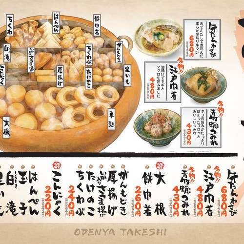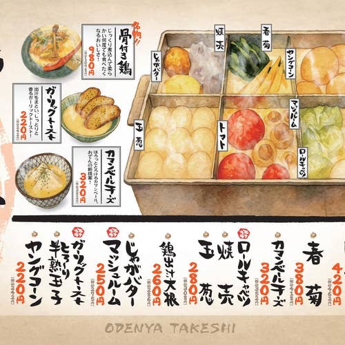 東京で日本の“出汁文化”を味わうなら〈おでん屋たけし〉。特製のあごだしと鶏だし、2種類の旨みが織りなす創作おでんが自慢です。店内には大きなおでん鍋が据えられ、湯気と香りに包まれながら職人の手仕事を目の前で楽しめます。豊洲市場直送の新鮮な刺身、季節の食材を使った限定おでん、日本酒におでん...